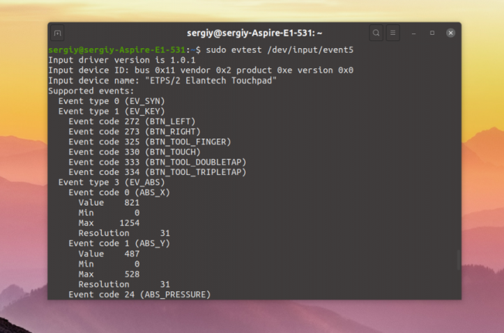 Далее попробуйте водить пальцем по тачпаду. В выводе утилиты появится отладочная информация её можно отправить в баг репорте к вашему дистрибутиву или прикрепить к вопросу на форуме когда вы будете пытаться выяснить почему тачпад не работает.