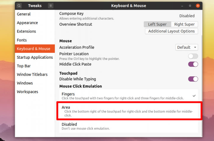 В Ubuntu есть возможность выполнять клик правой кнопкой с помощью тачпада касаясь его двумя пальцами. Но это не всегда удобно, если у вас нет физических кнопок под тачпадом, вам будет более удобно выполнять клик правой кнопкой просто касаясь правого нижнего угла. Для того чтобы это включить сначала установите Gnome Tweak Tools: