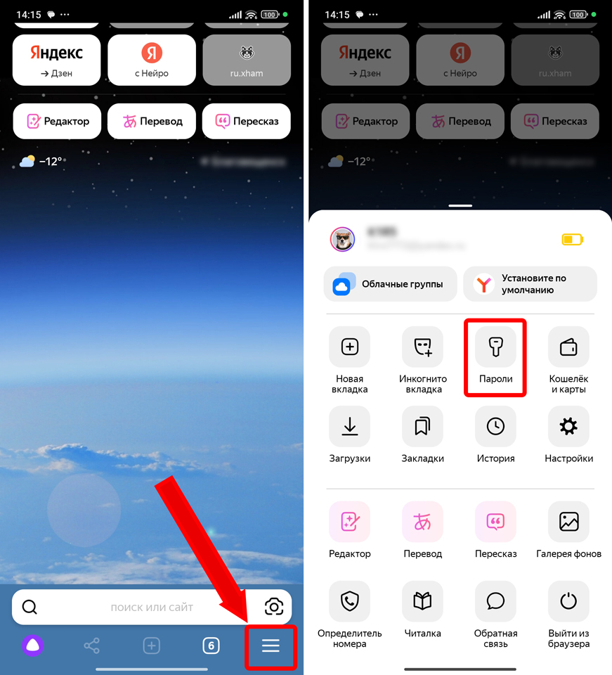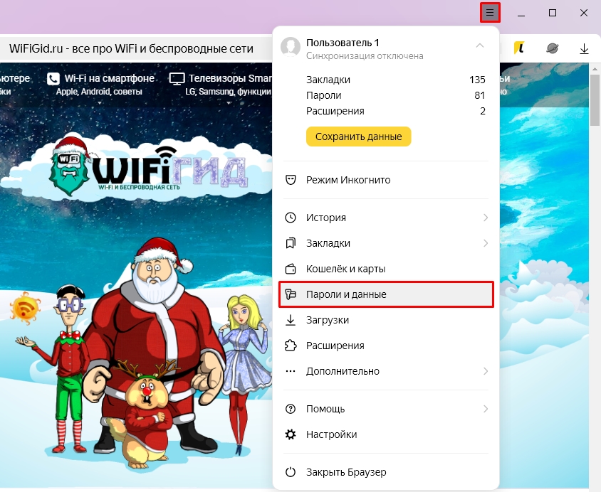 - В браузере откройте меню и зайдите в раздел «Пароли».
