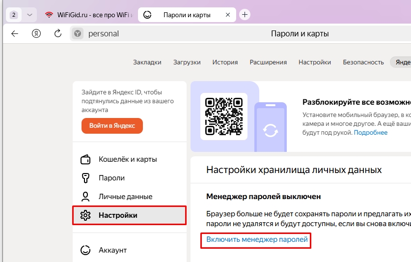 - Найдите ссылку «Включить менеджер паролей». Если функция уже включена, то там будет ссылка с надписью «Выключить…» (в таком случае ничего нажимать не нужно).