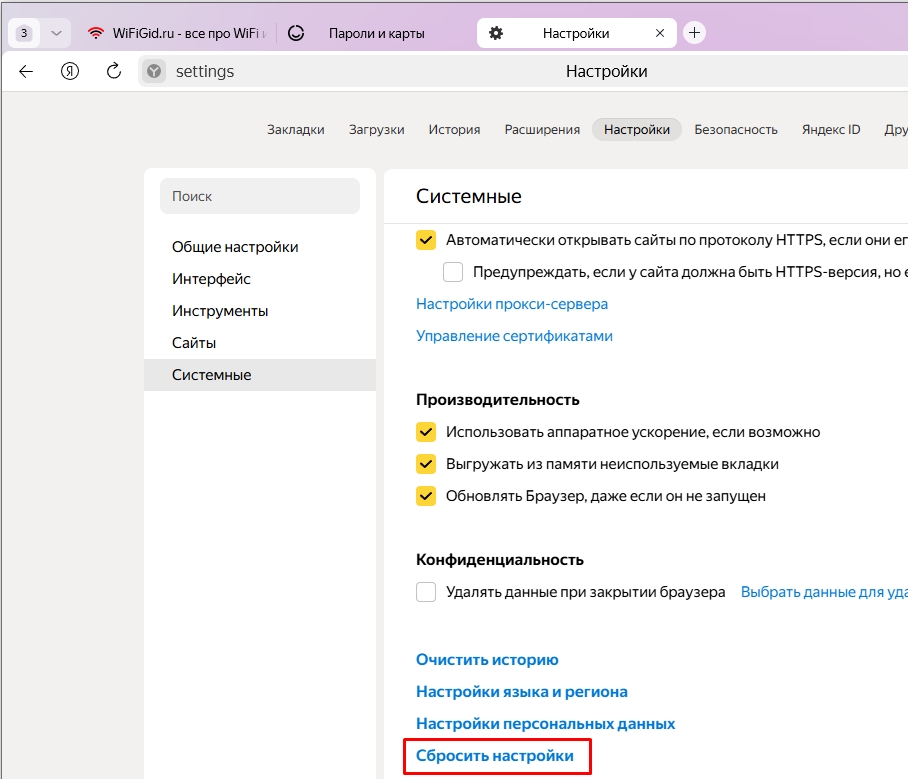 - Откройте меню, зайдите в «Настройки», слева выбираем «Системные», листаем вниз и кликаем «Сбросить настройки».