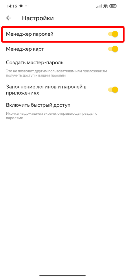 Возможно, на смартфоне у вас тоже отключена функция сохранения паролей в Яндекс Браузере. Проверим эту гипотезу: