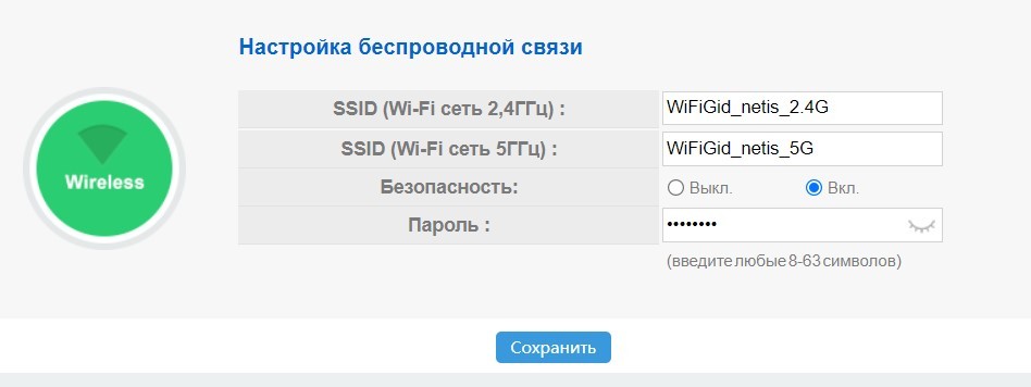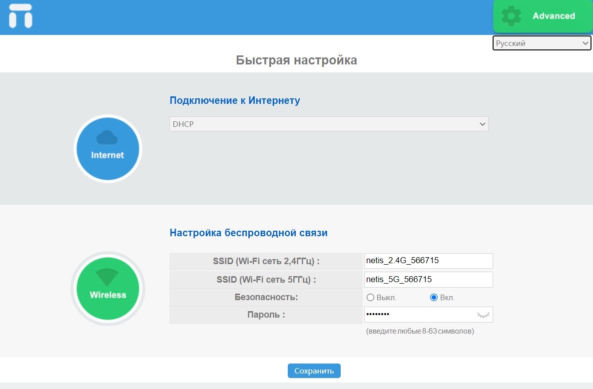 Начнем с самого простого – настройки Wi-Fi. На странице быстрой настройки просто задаем желаемые имена для сетей Wi-Fi (отдельно для 2,4 ГГц и 5 ГГц) и общий пароль к ним. Вот такой простотой мне и нравится конфигуратор netis – все сразу расположено на главной странице и в один экран.