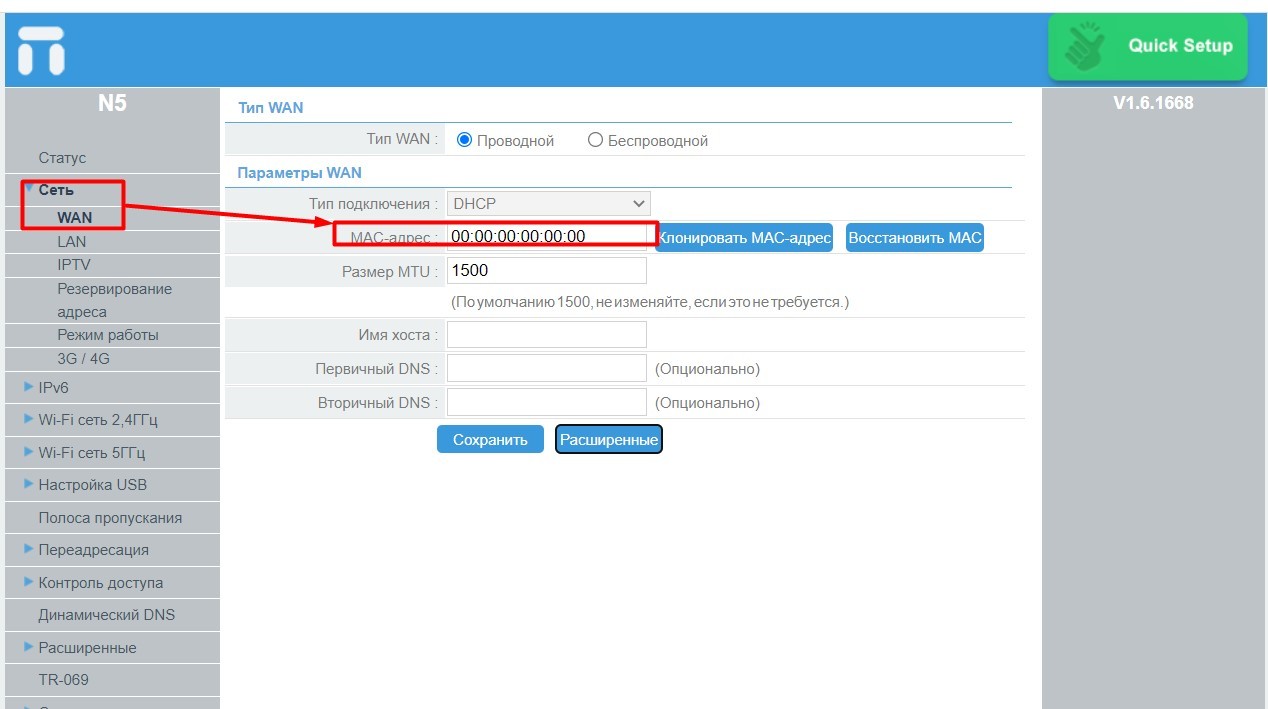- Сеть – WAN. Здесь можно задать дополнительные настройки для интернет-подключения. Например, задать нужный MAC-адрес при DHCP подключении. Заходим в раздел, жмем кнопку «Расширенные», получаем полный перечень. А еще обратите внимание здесь же на «Тип WAN», если выбрать беспроводной – то можно получать интернет с помощью подключения по Wi-Fi роутера (по большей части сценариев именно так можно использовать этот роутер в качестве репитера, но помним про срезание скорости вполовину).