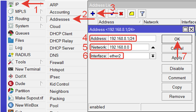 Для порта ether2 назначим IP-адрес 192.168.8.1