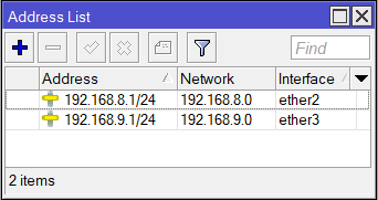 | /ip address add interface=ether2 address=192.168.8.1/24 /ip address add interface=ether3 address=192.168.9.1/24 |