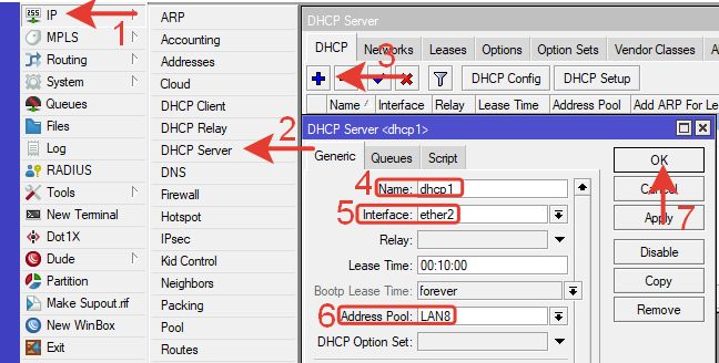 IP >> DHCP Server >> Нажимаем синий плюс >> Вводим параметры: