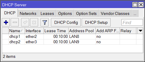 | /ip dhcp—server add interface=ether2 address—pool=LAN8 disabled=no /ip dhcp—server add interface=ether3 address—pool=LAN9 disabled=no |