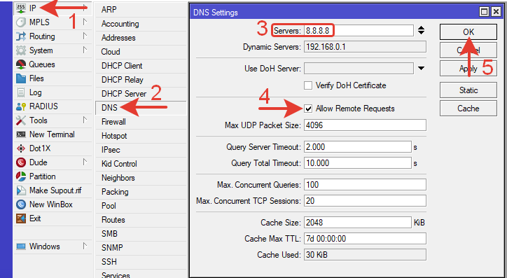 | /ip dns set allow—remote—requests=yes servers=8.8.8.8 |