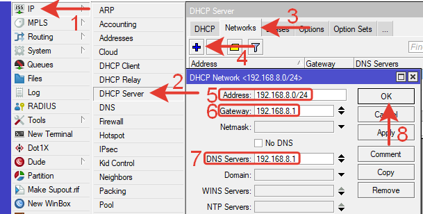 IP >> DHCP Server >> Вкладка Networks >> Нажимаем синий плюс.