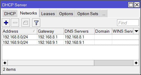 | /ip dhcp—server network add address=192.168.8.0/24 gateway=192.168.8.1 dns—server=192.168.8.1 /ip dhcp—server network add address=192.168.9.0/24 gateway=192.168.9.1 dns—server=192.168.9.1 |