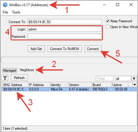Подключаемся через WinBox по MAC-адресу.