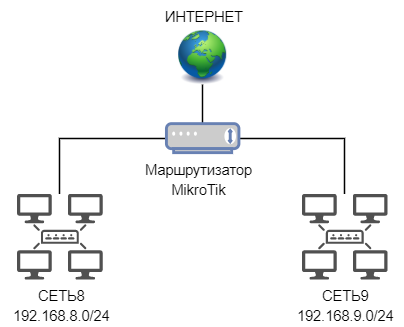 Есть роутер микротик и две ЛВС. Выполним настройки так, чтоб компьютеры обменивались пакетами на сетевом уровне и имели доступ в Интернет.