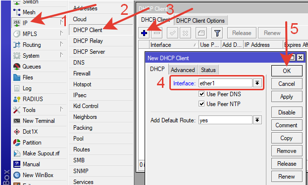 IP >> DHCP Client >> Нажимаем синий плюс >> В окне New DHCP Client настраиваем: