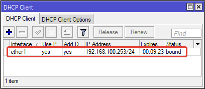 В результате в окне DHCP Client появится строка с интерфейсом ether1 к которому через некоторое время присвоится внешний IP провайдера.
