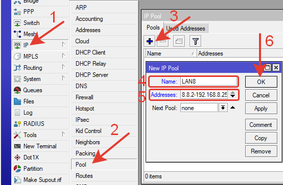 IP >> Pool >> Нажимаем синий плюс >>В окне NEW IP Pool вводим параметры: