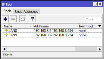 | /ip pool add name=LAN8 ranges=192.168.8.2—192.168.8.254 /ip pool add name=LAN9 ranges=192.168.9.2—192.168.9.254 |