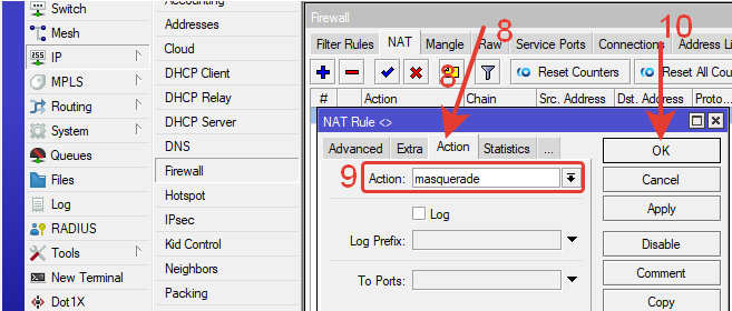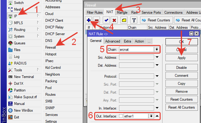 IP >> Firewall >> Вкладка NAT >> Добавляем правило нажав синий плюс.
