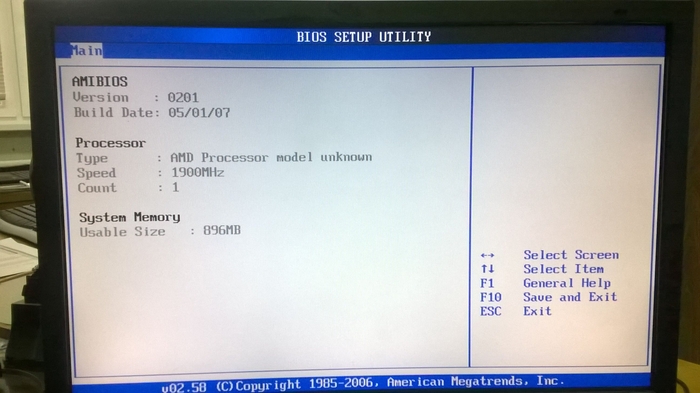 Первым делом заходим в меню BIOS (после включения ПК жать кнопку DEL) и смотрим, какая у нас версия. Version: 0201.