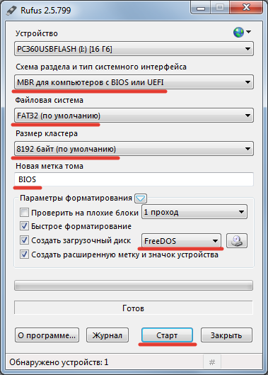 Когда файлы BIOS в наличии нужно сделать загрузочную флэшку, с которой будет выполняться обновление. Для этого понадобится сама флэшка и небольшая программа RUFUS.