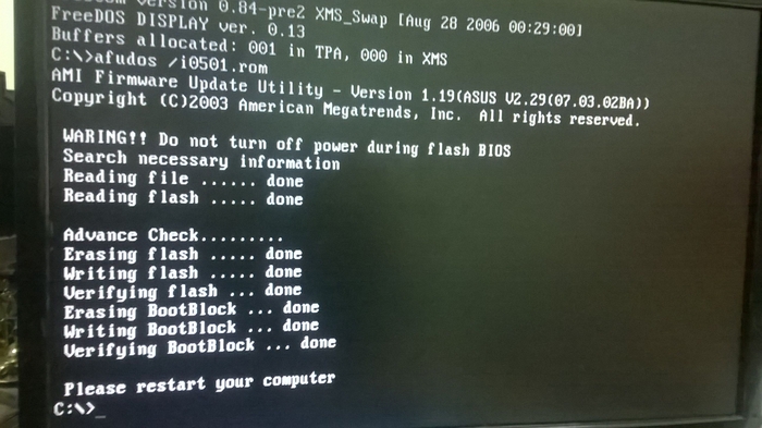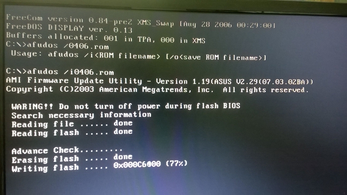 >afudos – выполнить приложение afudos (или AFU236U они есть на флэшке, скачиваются в одном архиве с прошивкой).