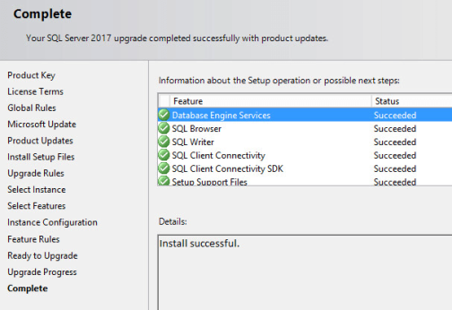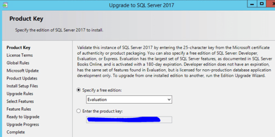 Я подключил ISO-стандарт SQL 2017 к моей машине. Теперь мы просто запускаем обычную настройку и выбираем Upgrade из предыдущей версии SQL Server.
