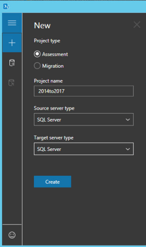 Как видите, я выбираю «Оценка», вставляю имя любого проекта (у меня это 2014to2017, так как это то, чего мы пытаемся достичь), и я устанавливаю тип исходного и целевого сервера как SQL Server, поскольку все, что мы собираемся сделать, это линейное обновление.
