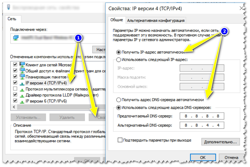 - Убедитесь, что в настройках TCP/IP установлено автоматическое получение IP-адреса. В поля, задающие адреса DNS-серверов, введите данные любых публичных ресурсов, например, Google (8.8.8.8 и 8.8.4.4). Сохраните настройку кабельного адаптера, нажав кнопку OK.