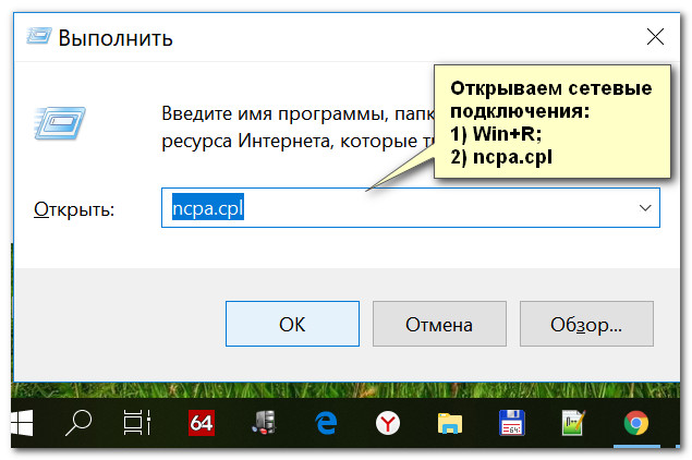 - В появившейся строке введите команду ncpa.cpl — откроются настройки сетевых адаптеров Windows.