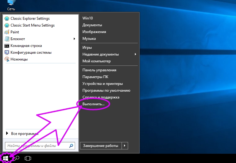 - Нажмите «Пуск» в главном меню Windows 10 выберите пункт «Выполнить».