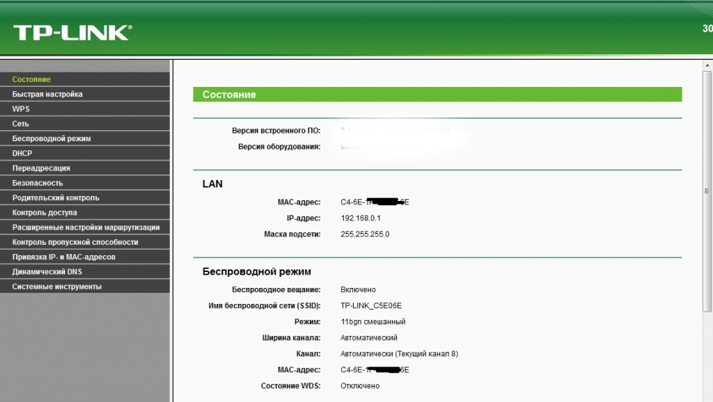 Вы попадёте на страницу сведений о параметрах роутера (пункт «Состояние» главного меню TP-Link).
