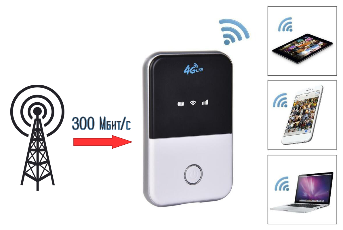 Портативный Wi-Fi-роутер 4G — компактное устройство, главными функциями которого являются приём сигнала с ближайшей вышки и раздача интернета «по воздуху» на несколько девайсов, таких как смартфоны, планшеты, персональные компьютеры или игровые консоли. Карманный маршрутизатор по принципу действия аналогичен домашнему роутеру, только для доступа к интернет-сети вместо проводного соединения использует сим-карту мобильного провайдера.