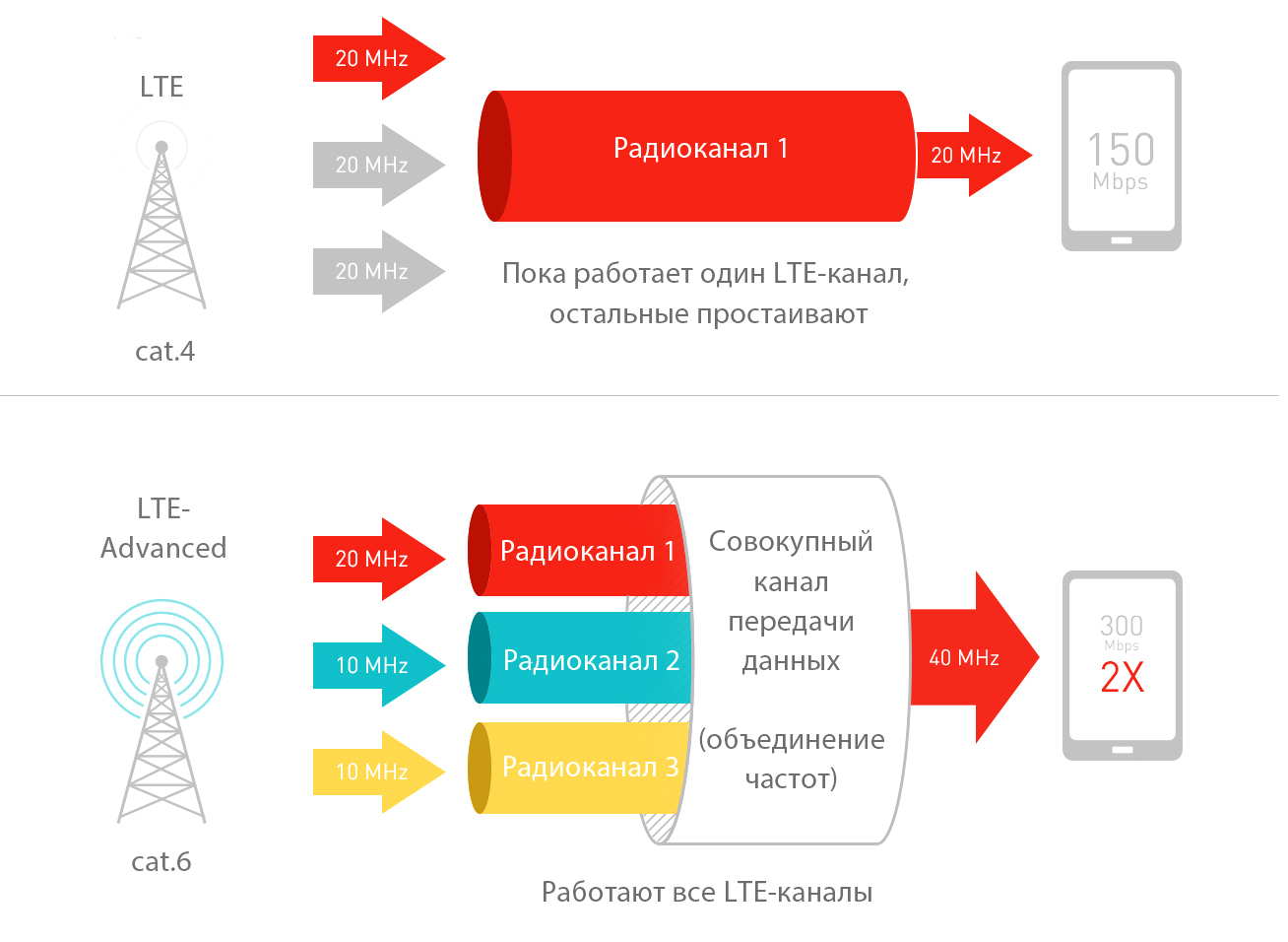 Объединение нескольких радиочастот в сетях LTE-A позволяет увеличить скорость приёма сигнала в два раза по сравнению с обычной LTE-сетью