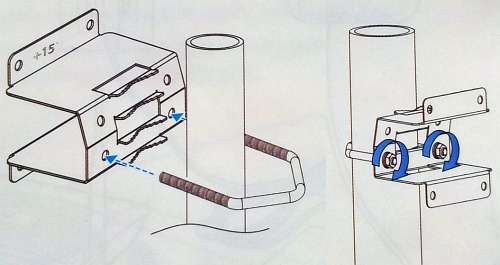 3. С помощью дополнительной гайки на задней стенке уличного блока подсоедините один из кабелей заземления. После закрепления кронштейна на болтах задней стенки приложите собранную конструкцию к мачте или опоре толщиной до 65 мм и закрепите её при помощи U-образного болта оставшимися гайками.