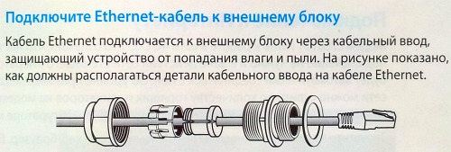 2. Во внешний блок заведите и подключите один из кабелей LAN. Кабель продевается через все детали гермоввода, который затем собирается согласно инструкции.