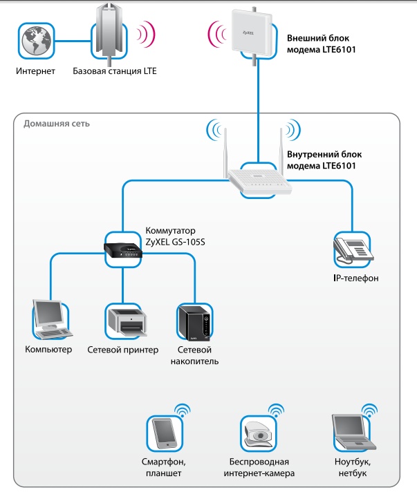 К роутеру ZyXEL LTE6101 через один из LAN-выходов могут подключаться компьютерные сети любой протяжённости, содержащие неограниченное количество сетевых маршрутизаторов и коммутаторов.