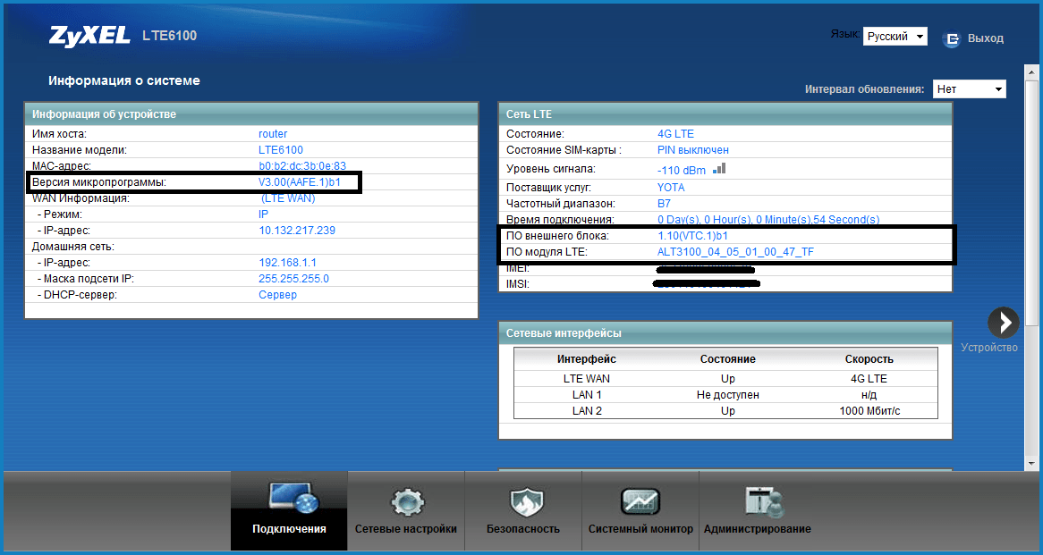 3. Отобразятся сведения о работе устройств LTE6101, в частности, информация о мобильной сети и Wi-Fi.