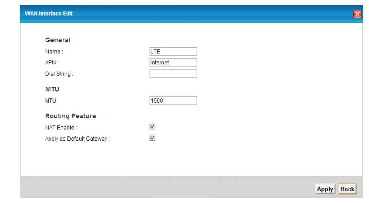 5. В таблице сведений о сети LTE нажмите на значок в виде блокнота (графа «Изменить»), назначьте имя профиля для подключения к сотовому провайдеру, сервер точки входа (APN). Значение MTU оставьте по умолчанию (приблизительно 1500 мс).