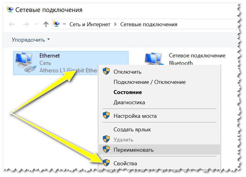 3. Нажмите правой кнопкой мыши на текущее подключение к Ethernet и в появившемся меню перейдите в свойства соединения.