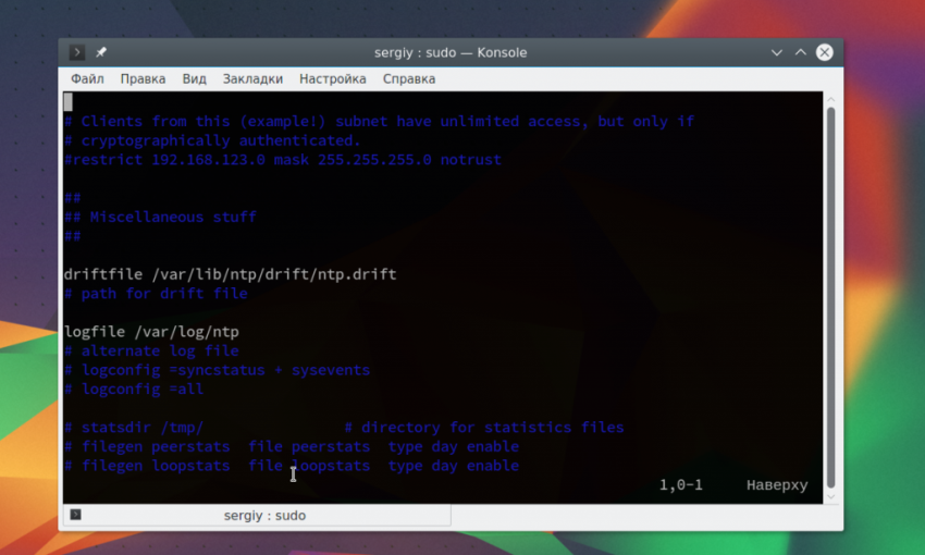 Файл ntp.conf отвечает за настройку службы синхронизации времени — ntpd. В файле указаны адреса ntp серверов, с которых служба будет получать время, а также общие настройки.