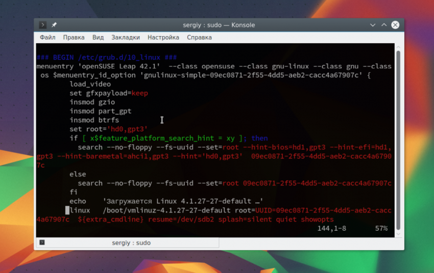 Этот конфигурационный файл Linux находится не в /etc из-за своего особого предназначения. Здесь содержатся все настройки загрузчика, пункты меню и другие параметры, поэтому он должен быть доступен еще до того как была подключена корневая файловая система.