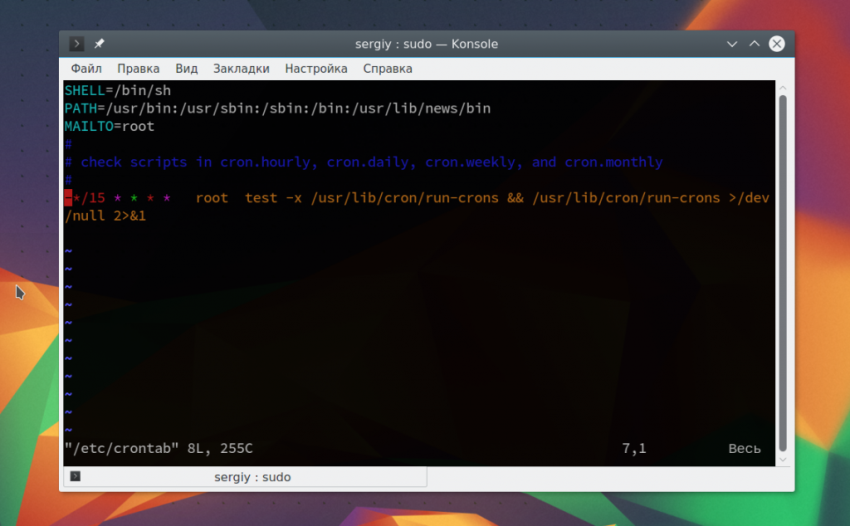 Crontab — файл настройки планировщика cron. Здесь записываются все задания, которые должен выполнить планировщик, а также время и периодичность. Этот файл не принято редактировать напрямую. Для этого используется утилита crontab -e.
