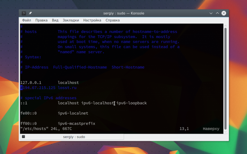 Файл /etc/hosts позволяет задавать псевдонимы для различных сетевых узлов. Таким образом, компьютер не обращается к DNS для получения IP домена, а берет его из hosts. Это позволяет, например, заблокировать доступ к нежелательным сайтам просто перенаправив их на localhost или же получить доступ к сайту по ip, которому еще не присвоен домен.