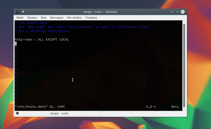 С помощью этих двоих файлов можно настраивать права доступа ко всем локальным службам. Например, вы можете разрешить доступ к службе apache только с локального компьютера. Это очень сильно повысит безопасность системы, если ваш компьютер подключен к публичной сети.