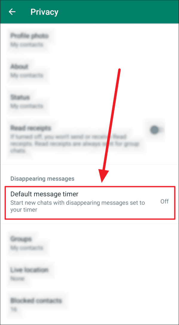 Коснитесь параметра «Таймер сообщений по умолчанию» под заголовком «Исчезающие сообщения» на экране «Конфиденциальность».