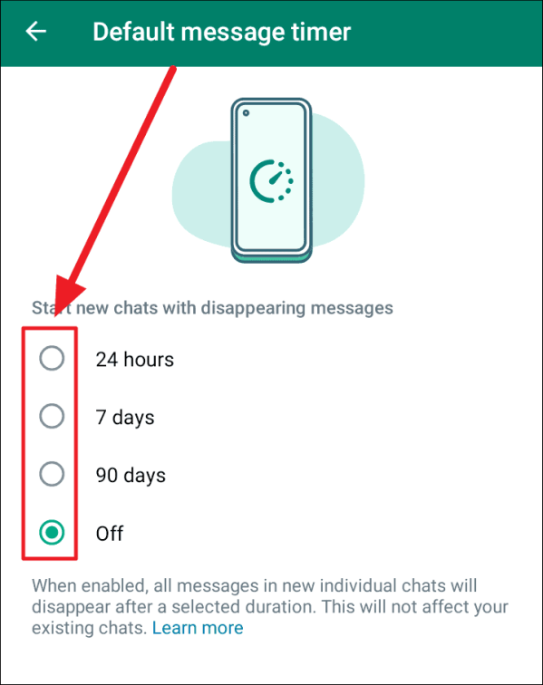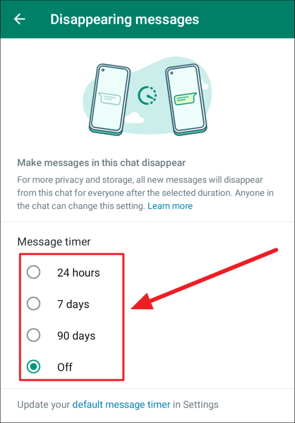 Вы увидите знакомый экран, но с другим названием – экран «Таймер сообщений по умолчанию». Это то же самое, что и экран «Исчезающие сообщения». Здесь также нажмите переключатель перед выбранной продолжительностью. Нажмите кнопку «ВЫКЛ», чтобы отключить эту функцию.