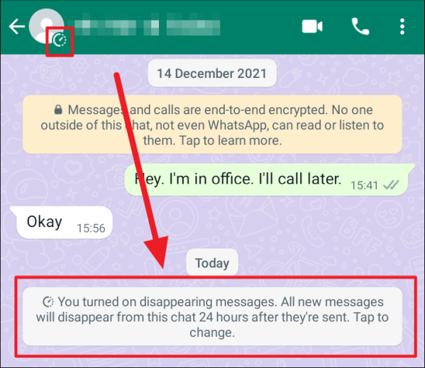 Все ваши сообщения в выбранном чате исчезнут по истечении указанного времени. Вы увидите значок таймера в нижней части изображения контакта/группы в дополнение к уведомлению о том, что «Исчезающие сообщения» включены. Уведомление также будет иметь выбранную вами продолжительность.