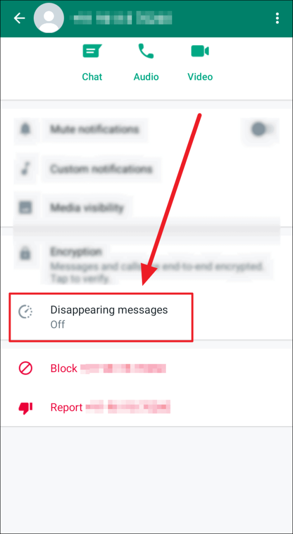 Немного прокрутите страницу контакта, чтобы найти и нажать/нажать «Исчезающие сообщения». По умолчанию он будет отключен.
