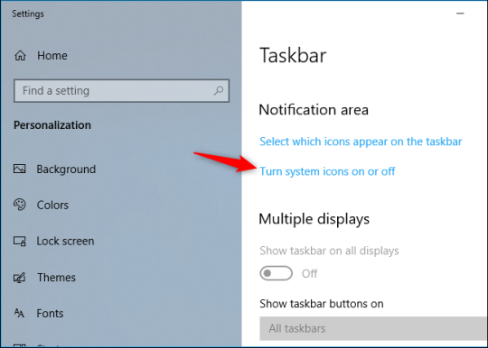 Прокрутите вниз в появившемся окне «Настройки» и нажмите «Включить или выключить системные значки» в области уведомлений.