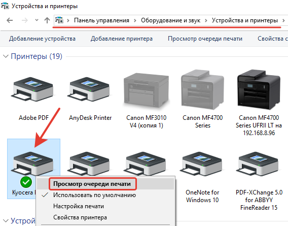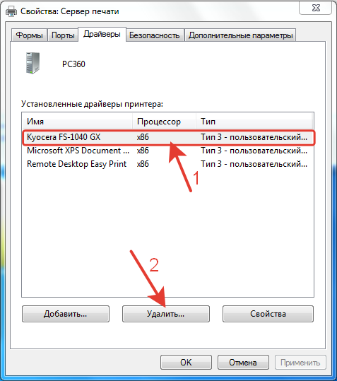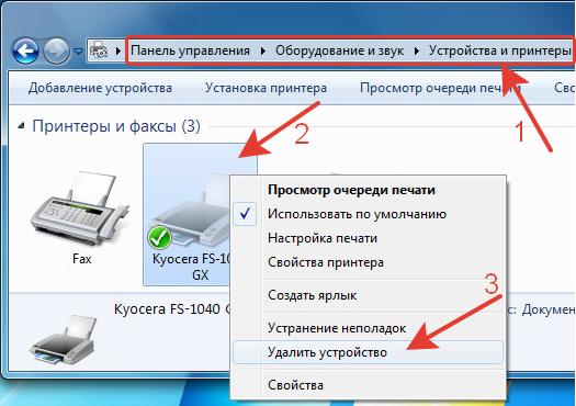 Выбираем нужный принтер. В данном случае Kyocera FS-1040. Нажимаем на нем правой кнопкой мыши и выбираем в раскрывшемся меню пункт «Удалить устройство». Или выбираем на верхней панели окна кнопку «Удалить устройство».
